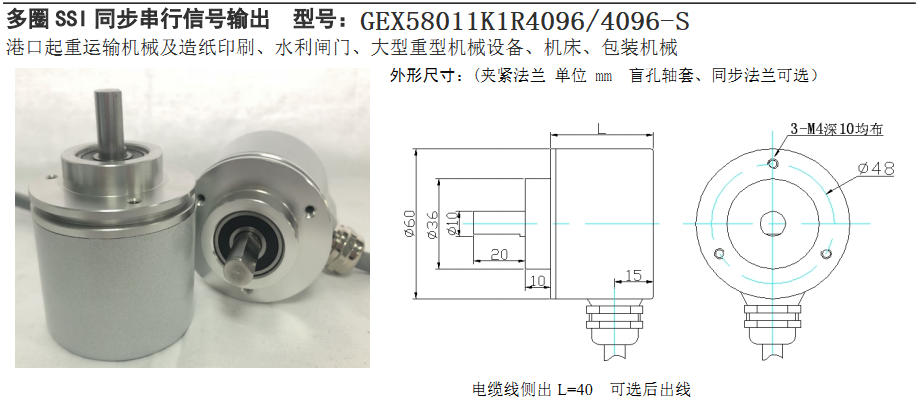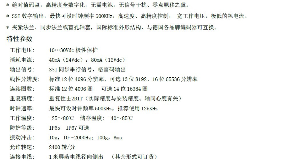 * 绝对值码盘,高精度全数字化,无需电池,无信号干扰、零点飘移之虞 * SSI数字输出,最快可设时钟频率500KHz,高速度、高精度控制, 宽工作电压,极低的耗电流 * 夹紧法兰、同步法兰或盲...