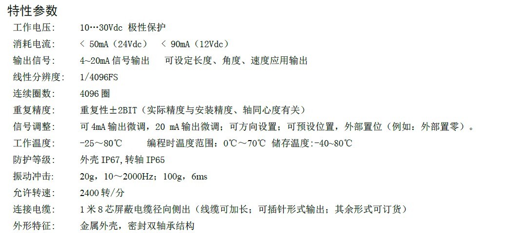 绝对值数字码盘,内置信号转换,4~20mA模拟电流,方便连接各设备 * 智能软件设定,多用途、多功能,直接对应单圈角度,转动平移速度测量 * 4mA 对应值、20mA 对应值任意设定及微调;方向设定...